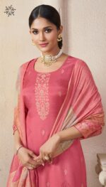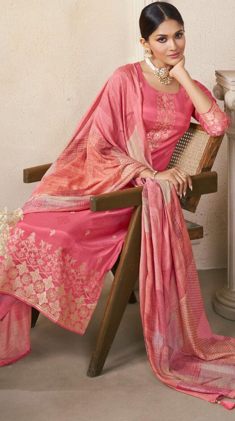 Elevate your festive style with this luxurious silk ethnic suit in radiant charm colors. The kurta features intricate self-Zari embroidery in ethnic motifs, gracefully adorning the neckline, sleeves, and bodice. Paired with matching straight pants and a flowing dupatta edged in detail, this ensemble blends tradition with modern elegance.