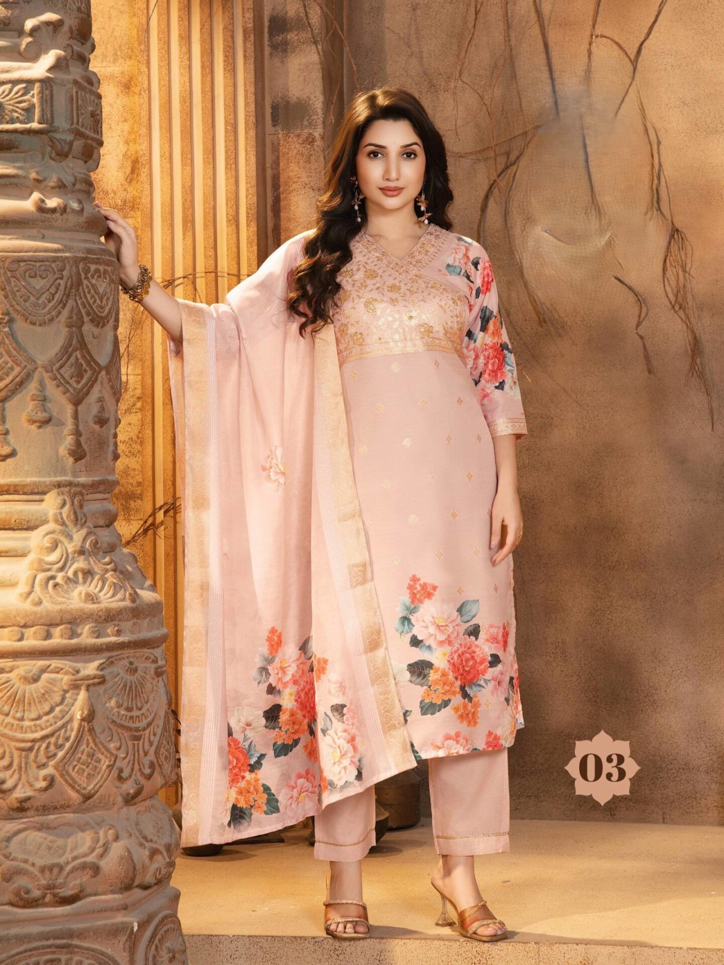 - Dupatta: Digitally printed Chanderi with a regal Jacquard border that adds a touch of grandeur.