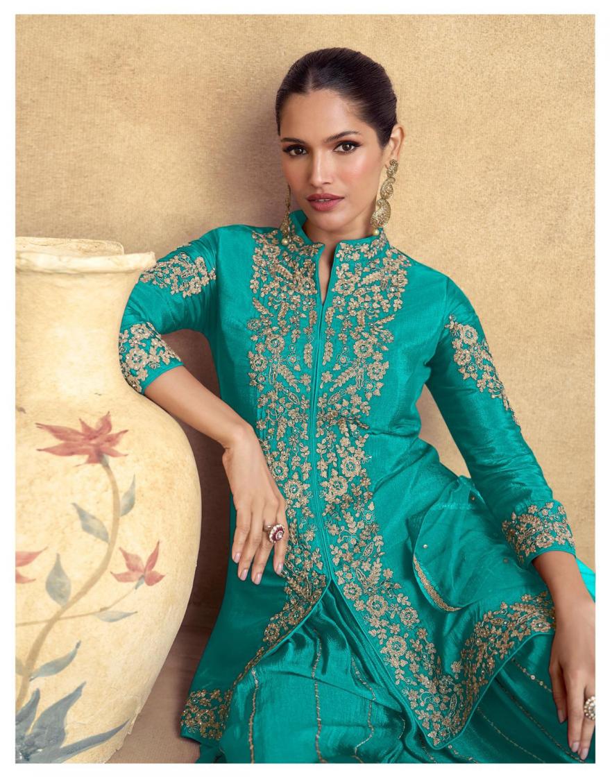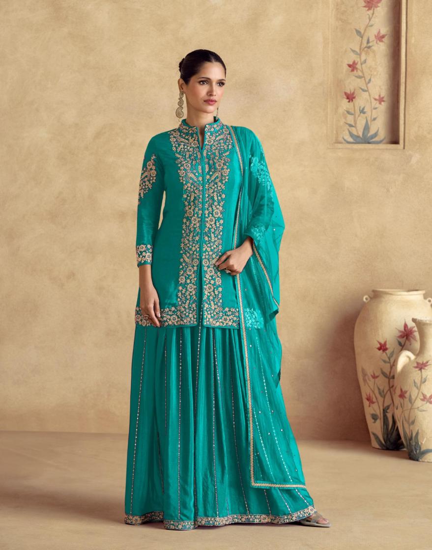 Made from soft Chinon silk, this outfit includes a stylish high-neck kurta and a divided skirt & net dupatta. It’s fully stitched and decorated with fine embroidery—perfect for weddings, celebrations, or any special occasion. Available in 5 vibrant colors to match your mood and style.