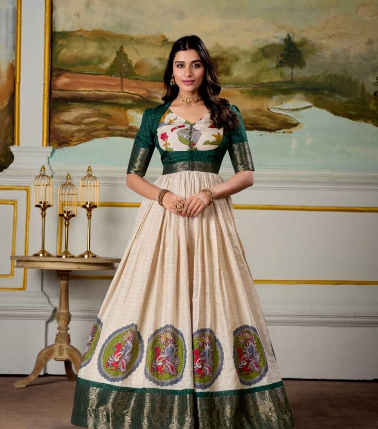A distinctive silk-woven Anarkali pattern gown with intricate zari work. The Kalamkari prints add a unique touch, complemented by a beautiful jacket. It offers an exceptional silhouette, perfect for standing out on special occasions.