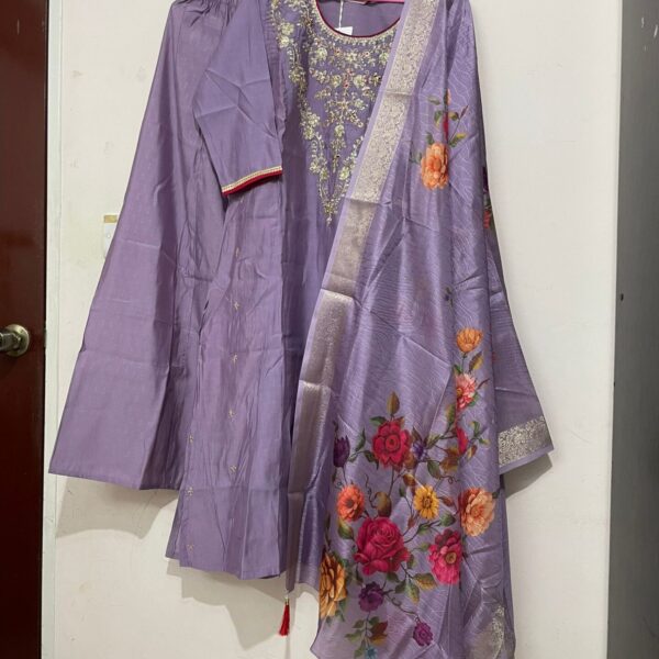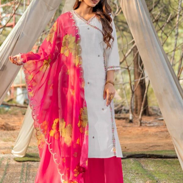 Intricate Schiffli embroidery on linen fabric with cotton lining and exceptional craftmanship. Bottom made with cambric cotton added with pocket. Dupatta features digital printing on viscose fabric adorned with tassels.