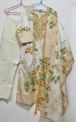 Intricate Schiffli embroidery on linen fabric with cotton lining and exceptional craftmanship. Bottom made with cambric cotton added with pocket. Dupatta features digital printing on viscose fabric adorned with tassels.