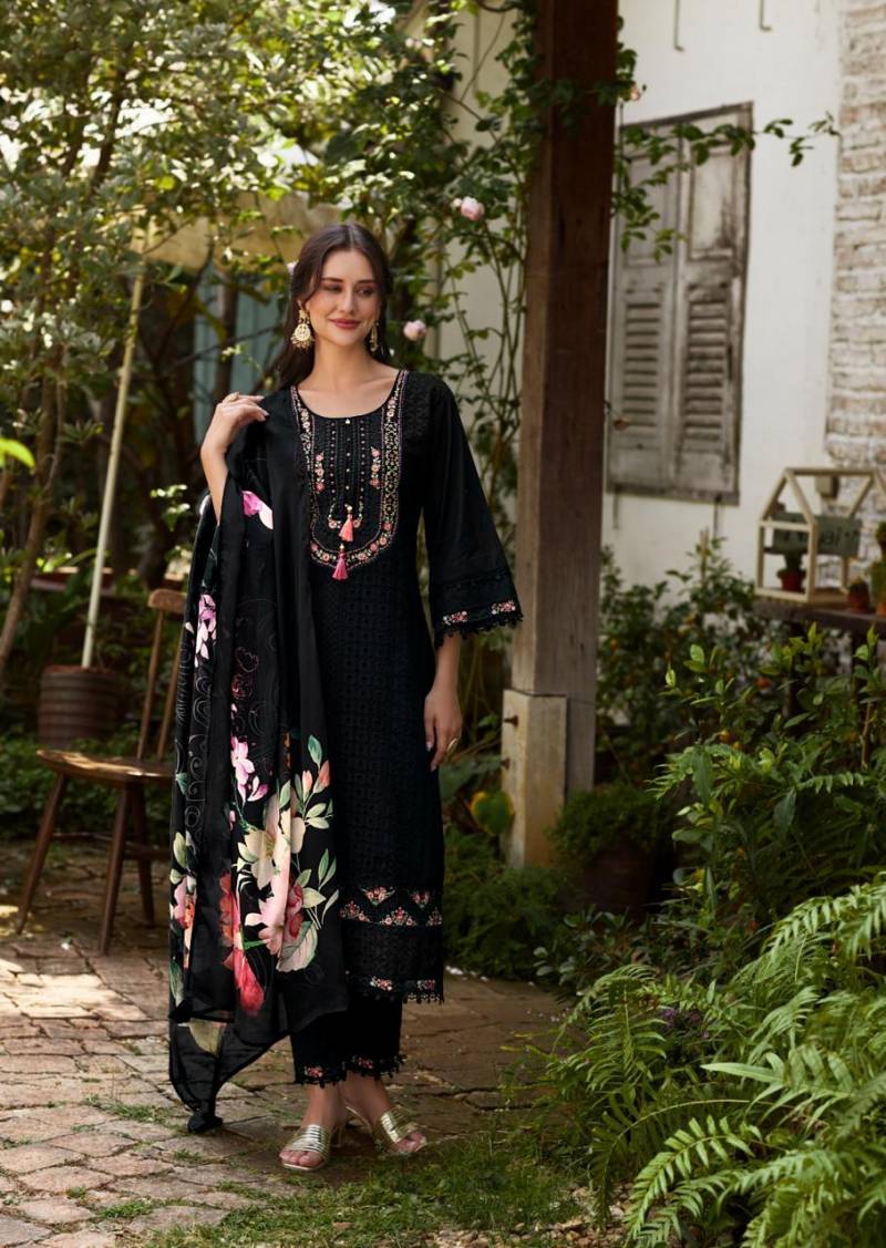 Intricate Schiffli embroidery on linen fabric with cotton lining and exceptional craftmanship. Bottom made with cambric cotton added with pocket. Dupatta features digital printing on viscose fabric adorned with tassels.