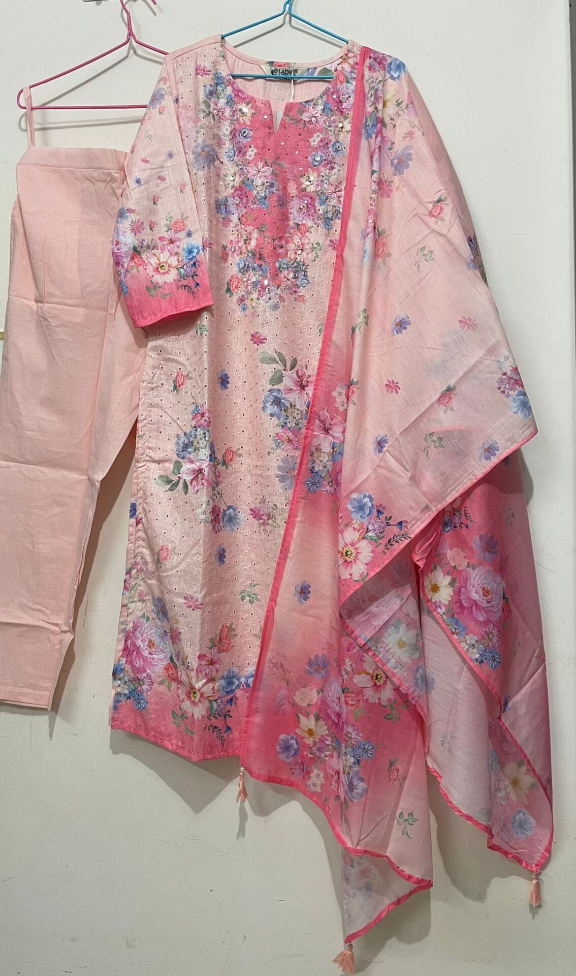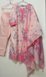 Intricate Schiffli embroidery on linen fabric with cotton lining and exceptional craftmanship. Bottom made with cambric cotton added with pocket. Dupatta features digital printing on viscose fabric adorned with tassels.