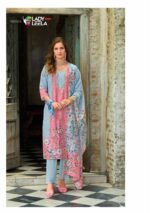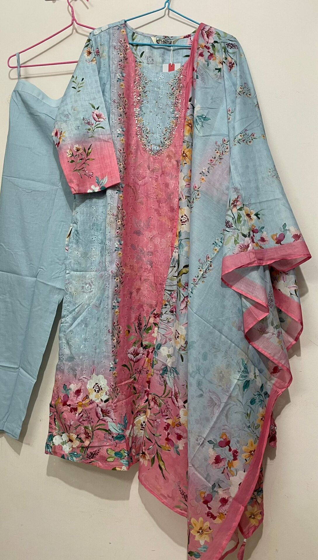 Intricate Schiffli embroidery on linen fabric with cotton lining and exceptional craftmanship. Bottom made with cambric cotton added with pocket. Dupatta features digital printing on viscose fabric adorned with tassels.